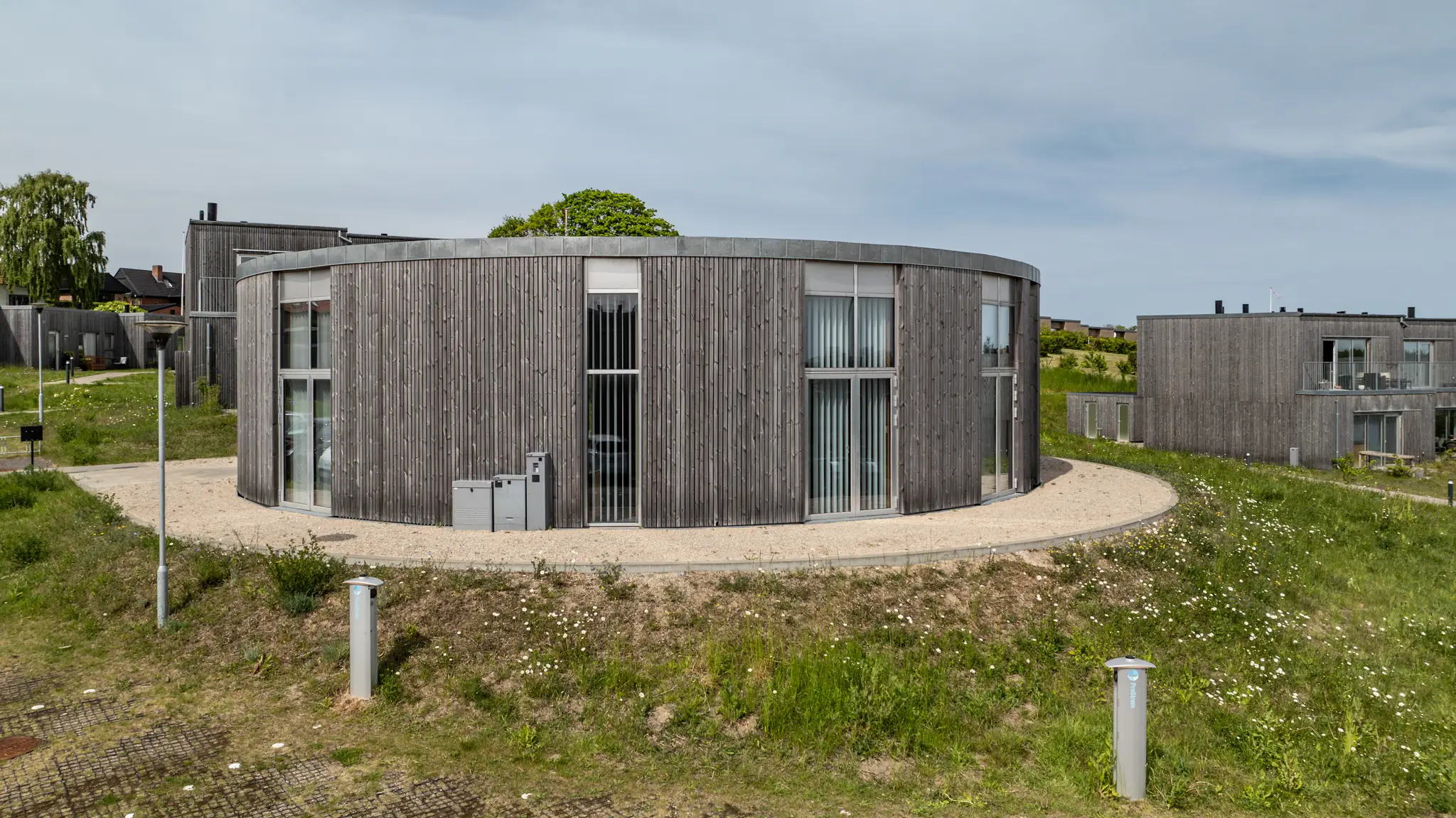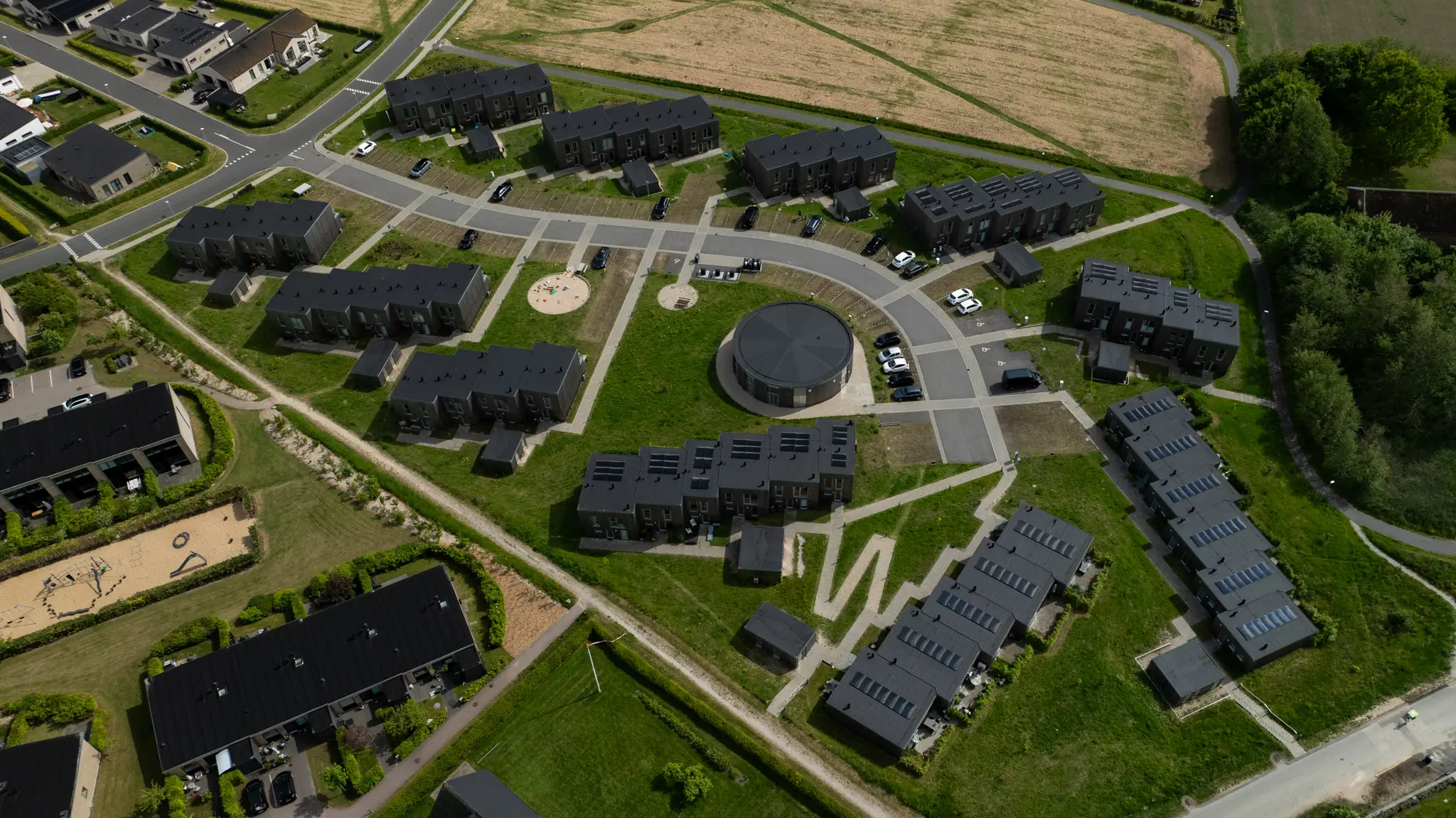 Som en del af projektet har vi stået for opførelsen af et mangekantet fælleshus med et samlet areal på 216 m². Dette fælleshus fungerer som et naturligt samlingspunkt for beboerne og bidrager til fællesskabet i området.